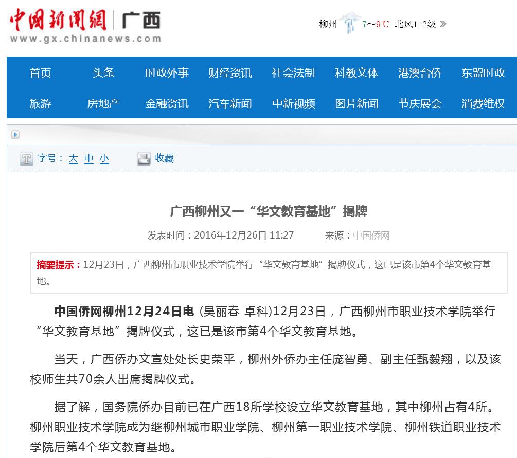 2016年12月26日,中国新闻网(中国侨网在23日)刊发华文基地落户我校的新闻。(截图:石玉丹)详情点击:http://www.gx.chinanews.com/news/2016/1226/8073.html;http://www.gx.chinanews.com/news/2016/1223/8015.html