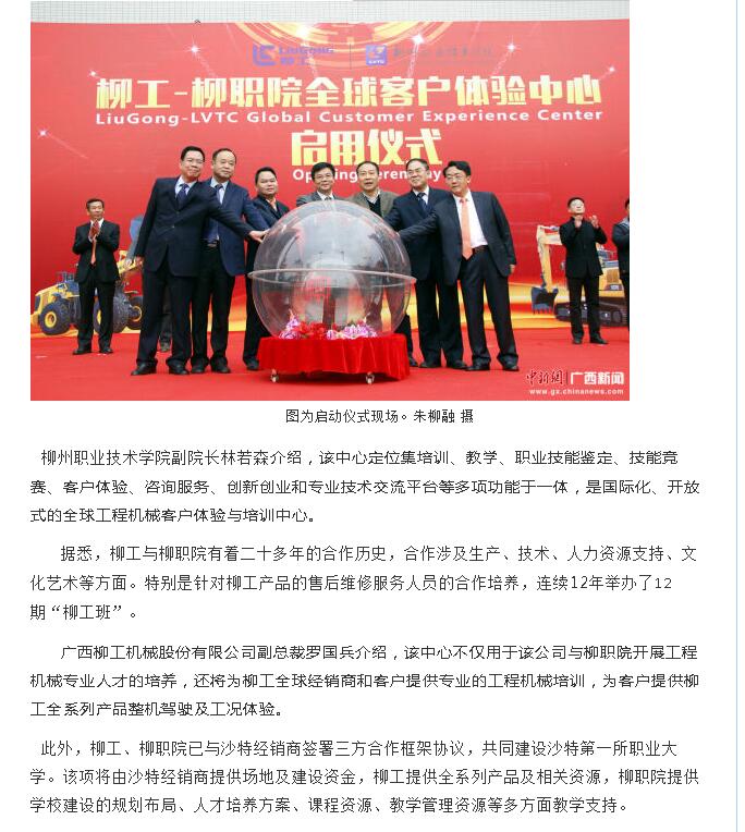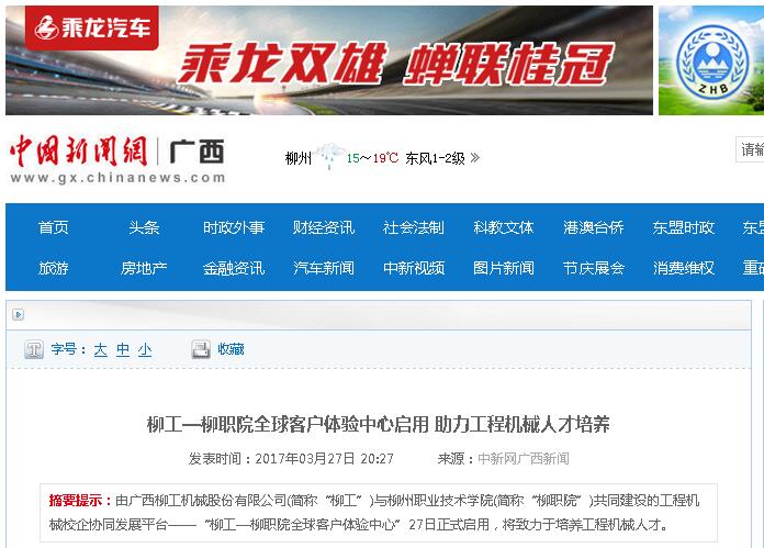 2017年3月27日,中国新闻网以“柳工-柳职院全球客户体验中心启用 助力工程机械人才培养”为题,刊发柳工-柳职院全球客户体验中心启用的新闻。详情点击:http://www.gx.chinanews.com/news/2017/0327/11275.html(截图:石玉丹)