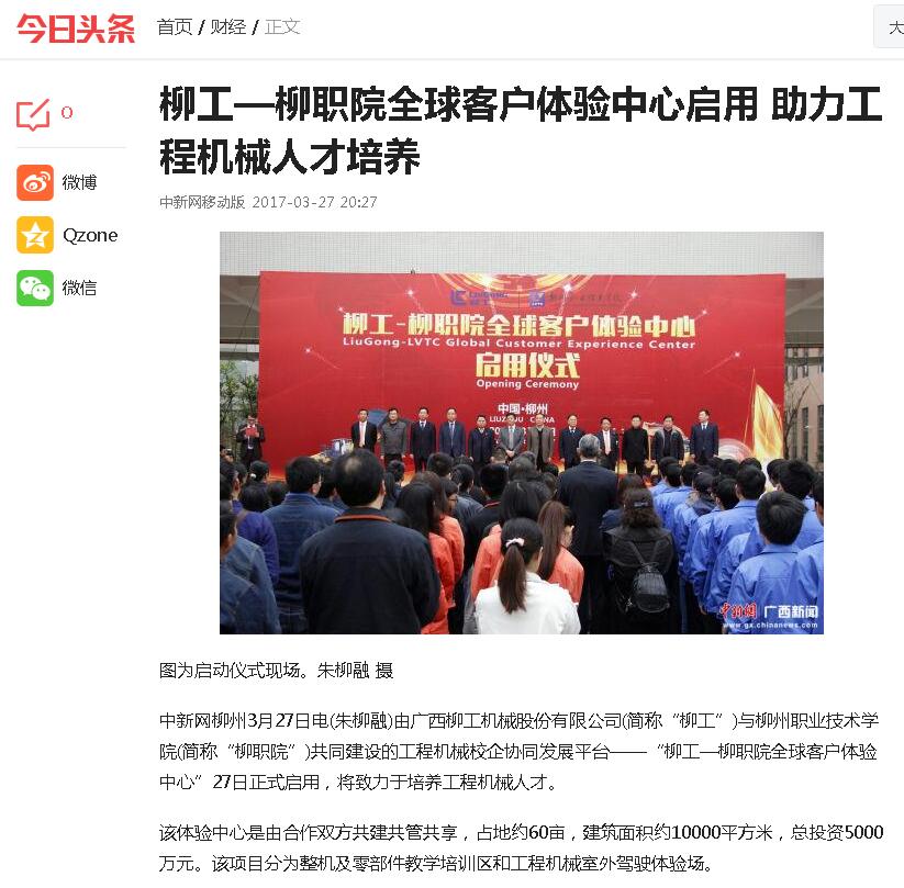 2017年3月27日,国内知名的新闻聚合平台“今日头条”网刊发柳工-柳职院全球客户体验中心启用的消息。详情点击:http://www.toutiao.com/a6402180591651111170/(截图:石玉丹)