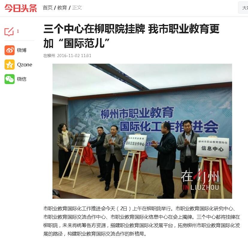 2016年11月2日,今日头条刊发三个中心在柳职院挂牌的消息。详情点击:http://www.toutiao.com/a6348206853318902018/(截图:石玉丹)
