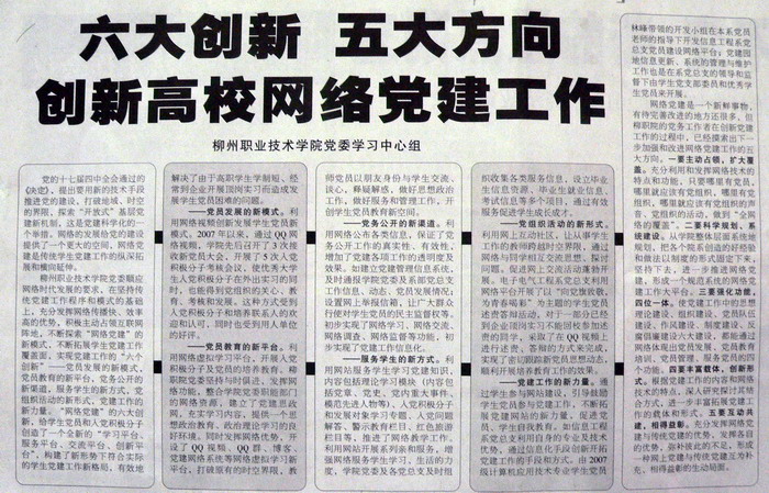 《柳州日报》刊发我院创新高校网络党建工作的理论文章 来源:柳州职业技术学院新闻网 作者:蒋玉梅 编审: 发布时间:2009-12-04 浏览次数: 次 【字体:小 大】 分享到: 2009年12月4日,《柳州日报》刊发了我院创新高校网络党建工作的理论文章。(图/蒋玉梅) 《柳州日报》刊发我院理论文章的截图 关闭 打印正文