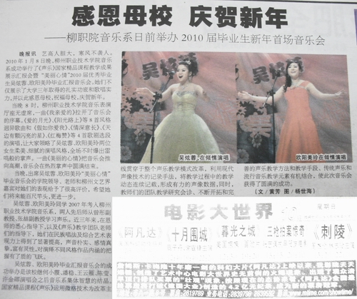 2010年1月10日,《柳州晚报》以“感恩母校 庆贺新年——柳职院音乐系日前举办2010届毕业生新年首场音乐会”为题,报道了音乐系《声乐》国家精品课程教学成果展示会暨2010届优秀毕业生吴炫蓉、欧阳美玲“美丽心情”毕业汇报音乐会的概况。(文、图/黄芳)