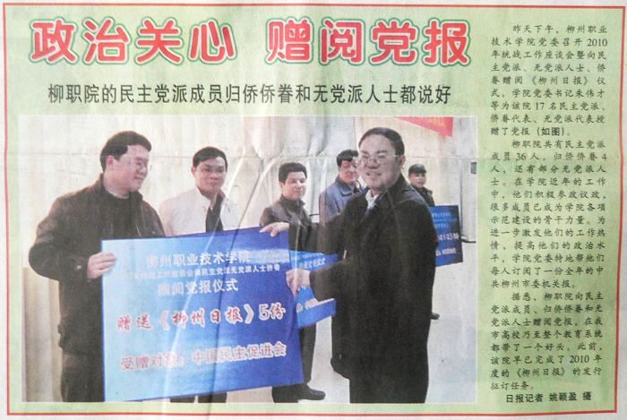 2010年1月19日,《柳州日报》头版刊登我院党委向民主党派、无党派人士、侨眷赠阅2010年度《柳州日报》的报道。