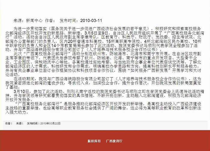 2010年3月11日,广西壮族自治区教育厅公众信息网广西高校服务北部湾行专题网站发布我院参加“服务广西高校服务北部湾行”信息。(图/蒋玉梅)