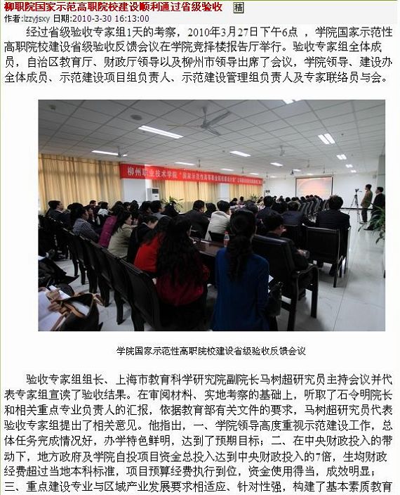 2010年3月30日,柳州教育网发布我院国家示范高职院校建设顺利通过省级验收的信息。(图/蒋玉梅)