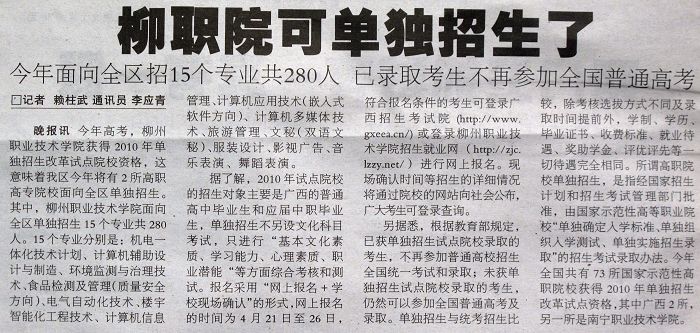 2010年4月11日,《柳州晚报》第4版报道我院获得2010年单独招生改革试点院校资格的新闻。据悉,在今年的单独招生中,我院投放了15个专业共计280个计划。(图/蒋玉梅)