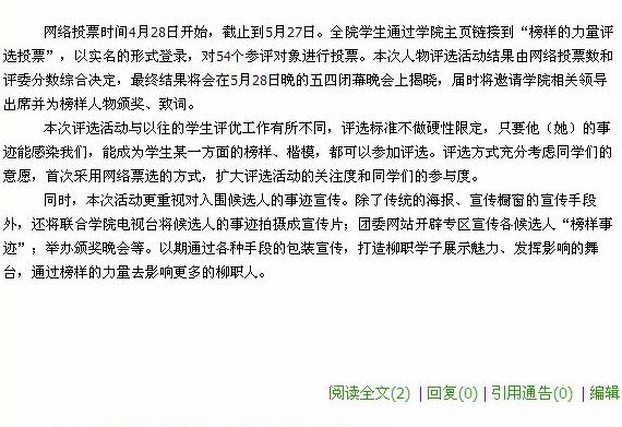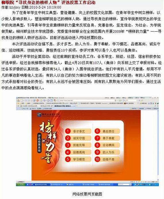 2010年5月24日,柳州教育网发布我院“寻找身边的榜样人物”评选投票工作启动的信息。(图/蒋玉梅)