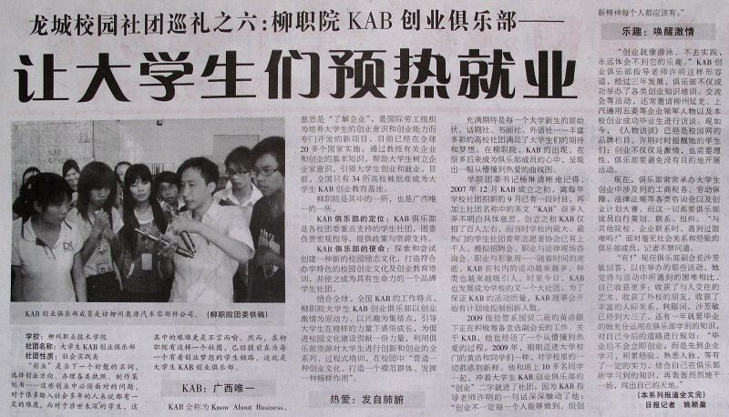 2010年5月26日,《柳州日报》“龙城校园巡礼”报道我院KAB创业俱乐部积极开展社会实践 进行“预热就业”的新闻。(图/蒋玉梅)