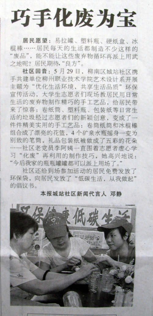 2010年6月2日,《柳州日报》以“巧手化废为宝”为题报道了我院艺术设计系志愿者到柳南区城站社区开展“优化生活环境,共享生活品质”环保宣传活动。志愿者们把卷纸筒、塑料瓶、包装纸等日常生活的垃圾变成了一件件精美实用的手工艺品,造型别致,创意新颖,以生动活泼的形式向广大居民宣传了“变废为宝”的“低碳生活”,引发了居民的浓厚兴趣。(文/阎志斌 图/覃静)