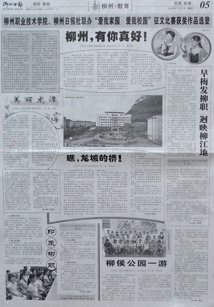 《柳州日报》教育版整版选登我院学生征文比赛获奖作品 来源:柳州职业技术学院新闻网 作者:蒋玉梅 编审: 发布时间:2010-07-19 浏览次数: 次 【字体:小 大】 分享到: 2010年7月13日,《柳州日报》教育版整版选登我院学生征文比赛获奖作品。(图/蒋玉梅) 《柳州日报》刊登我院学生作品版面截图 关闭 打印正文