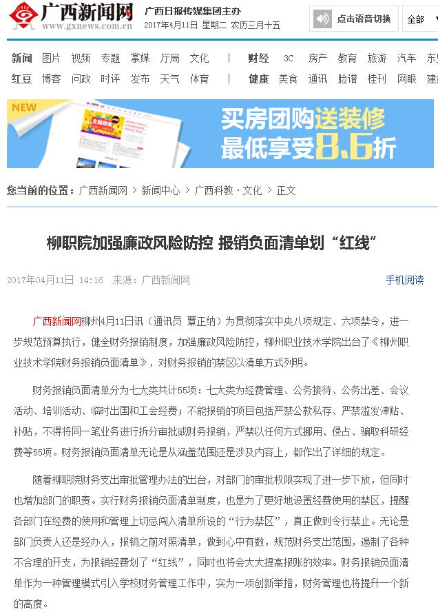 2017年4月11日,广西新闻网在“广西科教。文化”栏目中刊发我校加强廉政风险防控的新闻。详情点击:http://news.gxnews.com.cn/staticpages/20170411/newgx58ec74c5-16092181.shtml(截图:石玉丹)