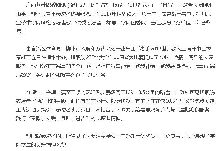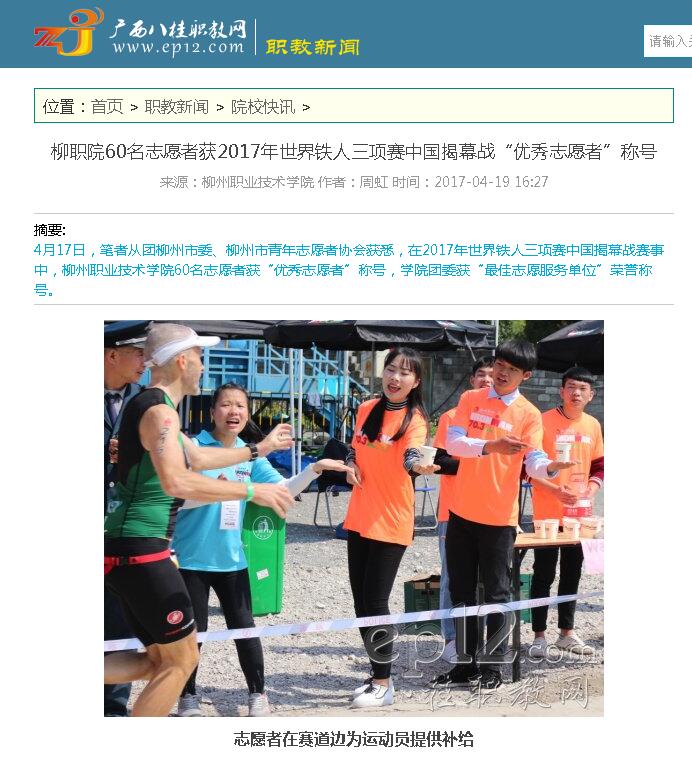 2017年4月19日,广西八桂职教网在职教新闻-院??煅独改靠⑽倚?0名志愿者获得2017世界铁人三项赛中国揭幕战“优秀志愿者”称号的消息。详情点击:http://www.ep12.com/a/zhijiaoxinwen/kuaixun/2017/0419/45969.html?。ń赝迹菏竦ぃ?/span>