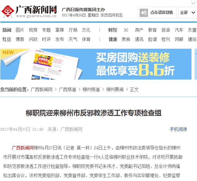 2017年4月27日,广西新闻网在广西频道-柳州频道-柳州要闻栏目中,刊发我校迎来柳州市反邪教渗透工作专项检查组的新闻。详情点击:http://lz.gxnews.com.cn/staticpages/20170427/newgx5901f6b9-16141465.shtml (截图:石玉丹)