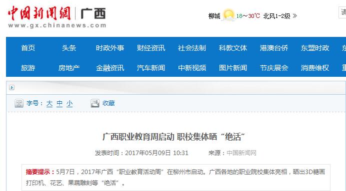 2017年5月9日,中国新闻网刊发了我校电子信息工程学院老师张晋华发明的3D糖画打印机在全区职教周上展出的新闻。详情请点击:http://www.gx.chinanews.com/news/2017/0509/12606.html (截图:石玉丹)