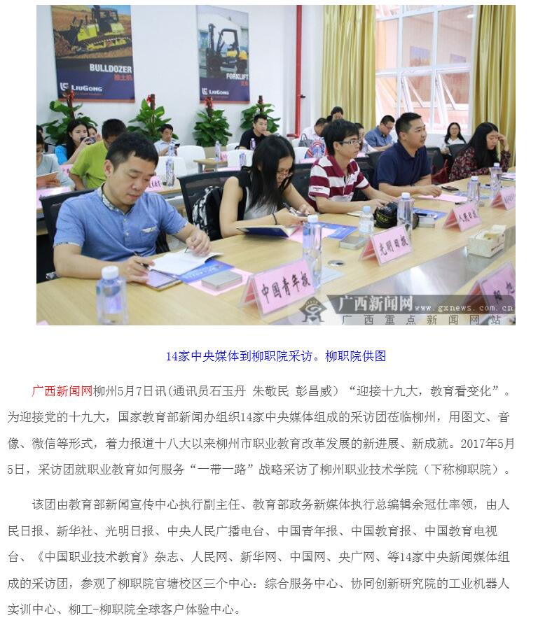 2017年5月7日,广西新闻网在广西频道-柳州频道-柳州要闻栏目中,刊发14家中央新闻媒体到我校官塘校区采访的新闻。 http://lz.gxnews.com.cn/staticpages/20170507/newgx590ef0fa-16165407.shtml (截图:石玉丹)