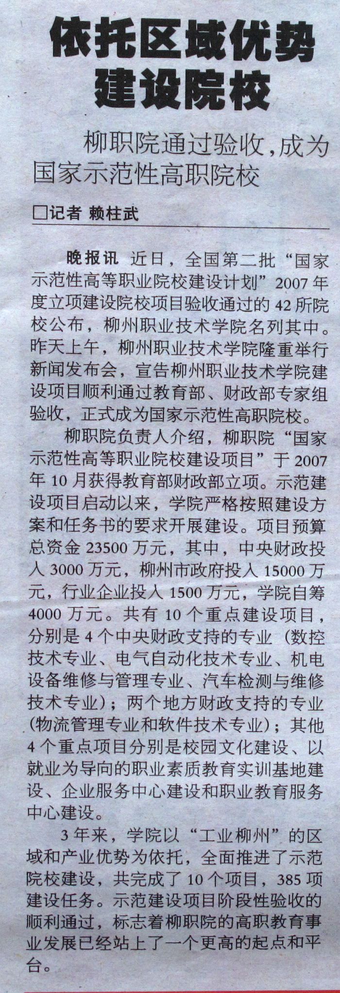 2010年7月27日,《柳州晚报》要闻版报道我院举行国家示范性高职院校建设项目通过教育部、财政部验收新闻发布会。
