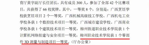 《广西教育信息》发布我院在全国职业院校技能大赛中获1个零部件3D测量与制造项目一等奖的信息