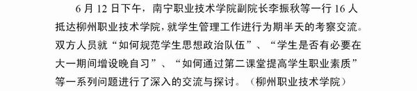 《广西教育信息》发布南宁职业技术学院领导教师到我院考察交流的信息 来源:柳州职业技术学院新闻网 作者:朱汝群 编审: 发布时间:2010-09-01 浏览次数: 次 【字体:小 大】 分享到: 《广西教育信息》2010年第70期发布南宁职业技术学院领导教师到我院考察交流的信息。(图/朱汝群) 《广西教育信息》发布我院信息的截图 关闭 打印正文