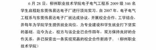 《广西教育信息》发布我院学子赴东莞伟易达电子厂顶岗实习的信息 来源:柳州职业技术学院新闻网 作者:朱汝群 编审: 发布时间:2010-09-02 浏览次数: 次 【字体:小 大】 分享到: 《广西教育信息》2010年第71期发布我院学子赴东莞伟易达电子厂顶岗实习的信息。(图/朱汝群) 《广西教育信息》发布我院信息的截图 关闭 打印正文