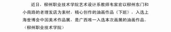 《广西教育信息》发布我院教师油画作品入选上海世博会中国美术作品展的信息 来源:柳州职业技术学院新闻网 作者:朱汝群 编审: 发布时间:2010-09-02 浏览次数: 次 【字体:小 大】 分享到: 《广西教育信息》2010年第75期发布我院教师油画作品入选上海世博会中国美术作品展的信息。(图/朱汝群) 《广西教育信息》发布我院信息的截图 关闭 打印正文