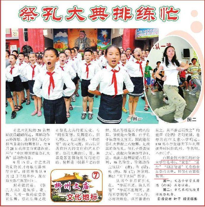 2010年9月16日,《柳州日报》头版报道我院参加祭孔大典的学生正紧张集训的新闻。