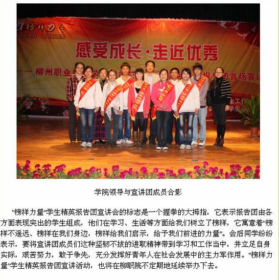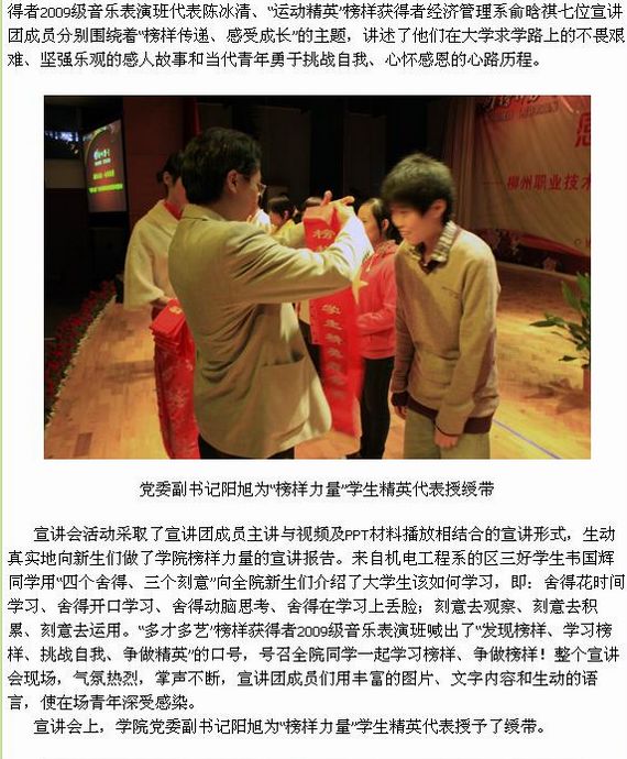 柳州教育网发布我院“榜样力量”学生精英报告团走进新生的信息 来源:柳州职业技术学院新闻网 作者:蒋玉梅 编审: 发布时间:2010-11-09 浏览次数: 次 【字体:小 大】 分享到: 2010年11月5日,柳州教育网发布我院“榜样力量”学生精英报告团走进新生的信息。(图/蒋玉梅) 柳州教育网发布我院信息的截图 关闭 打印正文
