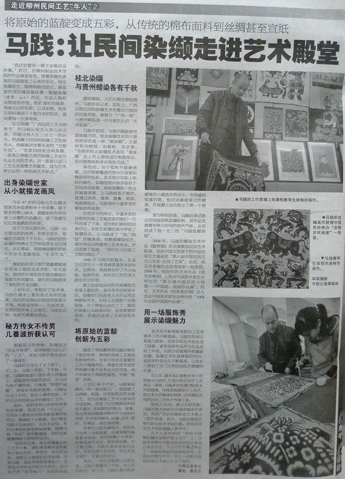 《南国今报》第六版《走近柳州民间工艺“牛人”》专题报道二以《将原始的蓝靛变成五彩,从传统的棉布面料到丝绸甚至宣纸——马践:让民间染缬走进艺术殿堂》为题,报道了我院艺术设计系教师马践的艺术人生。(文、图/蒋玉梅)