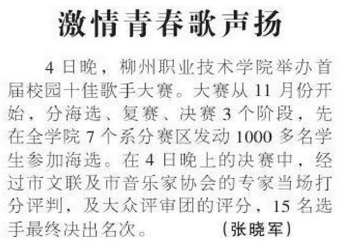 《柳州日报》报道我院举行校园十佳歌手大赛的新闻 来源:柳州职业技术学院新闻网 作者:蒋玉梅 编审: 发布时间:2010-12-08 浏览次数: 次 【字体:小 大】 分享到: 2010年12月6日,《柳州日报》报道我院举行校园十佳歌手大赛的新闻。(图/蒋玉梅) 《柳州日报》报道我院新闻的截图 关闭 打印正文