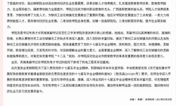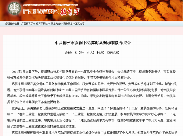 2011年3月29日,广西教育厅网站报道中共柳州市委副书记苏海棠到我院作报告的新闻。(朱汝群)
