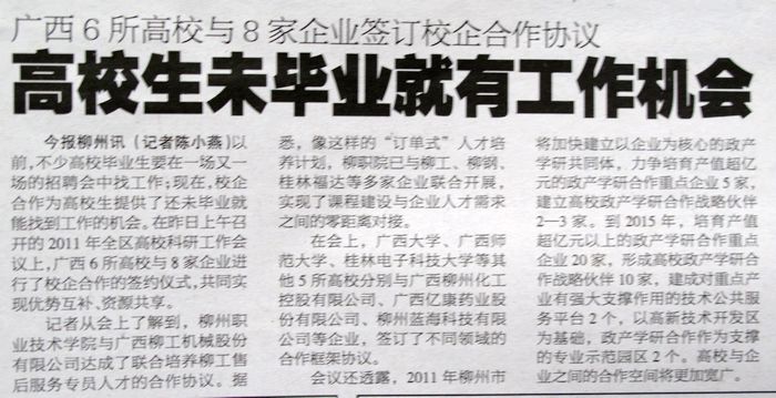 今报柳州讯(记者陈小燕)以前,不少高校毕业生要在一场又一场的招聘会中找工作;现在,校企合作为高校生提供了还未毕业就能找到工作的机会。在昨日上午召开的2011年全区高校科研工作会议上,广西6所高校与8家企业进行了校企合作的签约仪式,共同实现优势互补、资源共享。