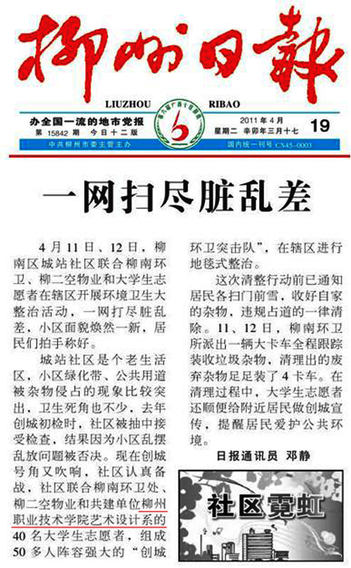 2011年4月19日,《柳州日报》报道我院艺术设计系40名青年志愿者到柳南区城站社区开展卫生大清理活动的新闻。(阎志斌)