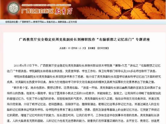 广西教育厅网站2011年4月28日发布广西教育厅安全稳定处周克依副处长来我院作“右脑联想之记忆法门”专题讲座的新闻。(朱汝群)