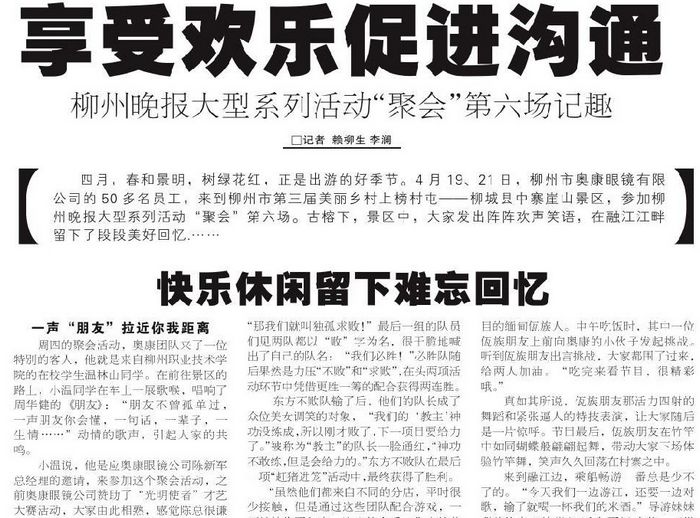 四月,春和景明,树绿花红,正是出游的好季节。4月19、21日,柳州市奥康眼镜有限公司的50多名员工,来到柳州市第三届美丽乡村上榜村屯—— —柳城县中寨崖山景区,参加柳州晚报大型系列活动“聚会”第六场。古榕下,景区中,大家发出阵阵欢声笑语,在融江江畔留下了段段美好回忆.……