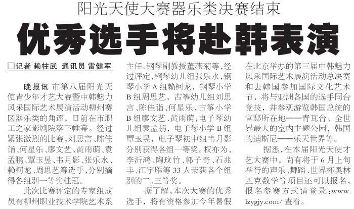 《柳州晚报》报道我院教师担任阳光天使大赛器乐类决赛评委的新闻