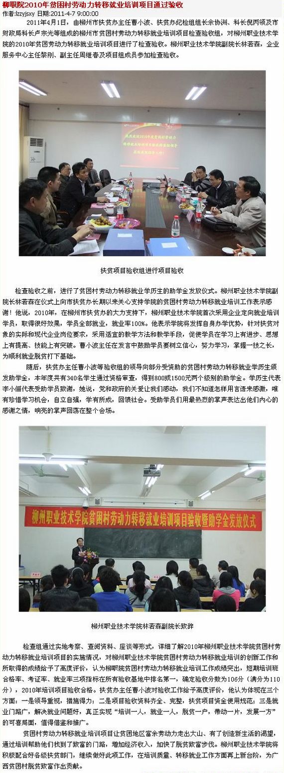 柳州教育网发布我院2010年贫困村劳动力转移就业培训项目通过验收的信息