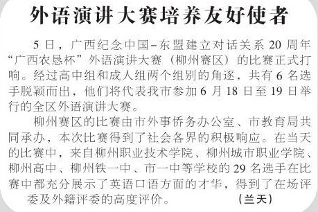 2011年6月月7日,《柳州日报》报道我院选手在“广西农恳杯”外语演讲大赛(柳州赛区)的比赛中表现优秀并获好评的新闻。