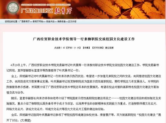 广西教育厅网站发布广西经贸职业技术学院领导一行来我院交流的新闻 来源:柳州职业技术学院新闻网 作者:朱汝群 编审: 发布时间:2011-05-07 浏览次数: 次 【字体:小 大】 分享到: 广西教育厅网站2011年5月5日发布广西经贸职业技术学院领导一行来我院交流校园文化建设工作的新闻。(朱汝群) 广西教育厅网站发布我院新闻的截图 关闭 打印正文