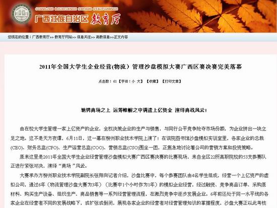 广西教育厅网站6月16日发布2011年全国大学生企业经营(物流)管理沙盘模拟大赛广西区赛决赛在我院举行的新闻。(朱汝群)