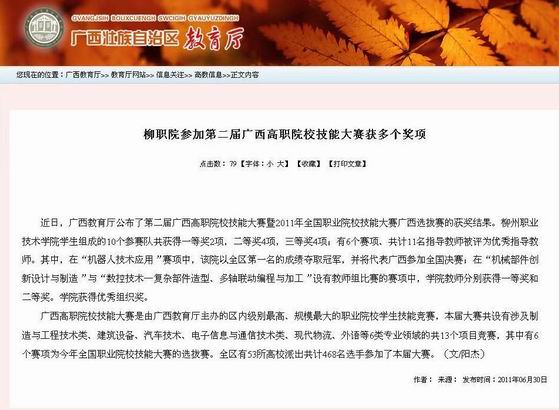 广西教育厅网站发布我院参加第二届广西高职院校技能大赛获多个奖项的新闻 来源:柳州职业技术学院新闻网 作者:朱汝群 编审: 发布时间:2011-07-01 浏览次数: 次 【字体:小 大】 分享到: 广西教育厅网站2011年6月30日发布我院参加第二届广西高职院校技能大赛获多个奖项的新闻。(朱汝群) 广西教育厅网站发布我院新闻的截图 关闭 打印正文