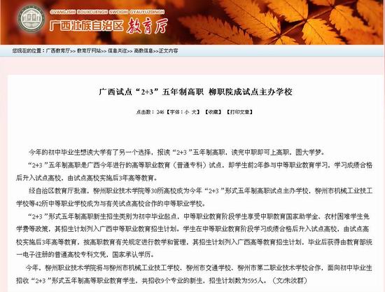 广西教育厅网站发布我院试点“2+3”五年制高职的新闻 来源:柳州职业技术学院新闻网 作者:朱汝群 编审: 发布时间:2011-07-20 浏览次数: 次 【字体:小 大】 分享到: 广西教育厅网站2011年7月19日发布我院试点“2+3”五年制高职的新闻。(朱汝群) 广西教育厅网站发布我院新闻的截图 关闭 打印正文