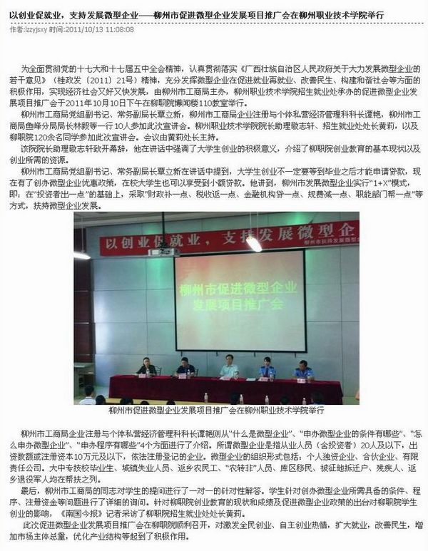 柳州教育网发布柳州市促进微型企业发展项目推广会在我院举行的信息 来源:柳州职业技术学院新闻网 作者:蒋玉梅 编审: 发布时间:2011-10-19 浏览次数: 次 【字体:小 大】 分享到: 2011年10月14日,柳州教育网发布柳州市促进微型企业发展项目推广会在我院举行的信息。(蒋玉梅) 柳州教育网发布我院信息的截图 关闭 打印正文