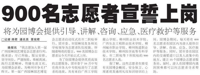 《柳州晚报》报道我院园博会志愿者参加宣誓上岗活动的新闻