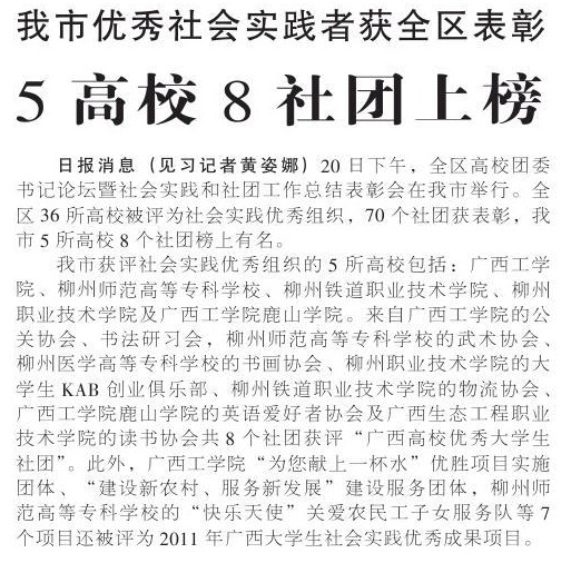 2011年11月23日,《柳州日报》报道我院大学生KAB创业俱乐部获全区表彰的新闻。
