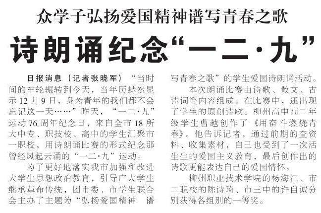 《柳州日报》报道我院学生在柳州市纪念“一二·九”运动爱国诗朗诵比赛中获一等奖的新闻