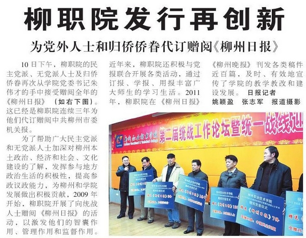 为了帮助广大民主党派和无党派人士加深对柳州本土政治、经济和社会、文化建设的了解,发挥参与地方政治生活的积极性,提高参政议政能力,为柳州和学院发展做出积极贡献,2009年开始,柳职院开展了向统战人士赠阅《柳州日报》的活动,以激发他们的智囊作用、管理作用和监督作用。