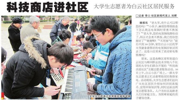 □记者李劼 社区新闻代言人刘晖 晚报讯“老大爷,有什么可以帮您的吗?”小伙子,麻烦你帮我检查下怎么我这电饭锅时常煮不熟饭了?”老大爷,您的电饭锅线路松动了,所以才会煮不熟饭,我已经给您接好了”谢谢??!”不用客气!”前后不到10分钟,家住白云小区的罗大爷就拿着修好的电饭锅回家试用去了。这是小区里来了流动家电维修摊吗?原来,这是鱼峰区荣军街道白云社区与柳州职业技术学院八个社团的大学生们联合开展的“科技商店进社区”主题志愿者服务活动。10日上午,白云小区广场上,一群大学生志愿者正忙活着帮助居民维修家电?;疃殖?,大学生志愿者们还向广大社区居民介绍如何识别真假币 、宣传环保知识等 ,同时还派出两支志愿服务队 ,入户为社区高龄老人打扫家庭卫生 ,为困难家庭的孩子辅导功课。