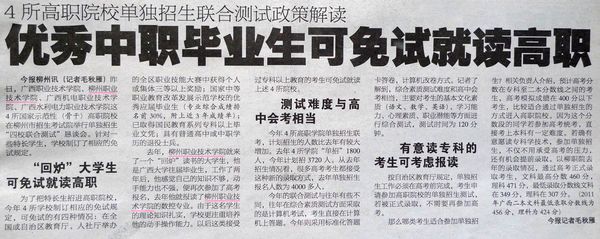 去年,柳州职业技术学院就来了一个“回炉”读书的大学生,他是广西大学往届毕业生,工作了两年后,他感觉自己的知识不够,动手能力也不强,便再次参加了高考报名,去年他就报读了柳州职业技术学院的数控专业。由于这名学生的理论知识扎实,学校更注重培养他的动手操作能力。以后这类接受过专科以上教育的考生可免试就读上述4所院校。