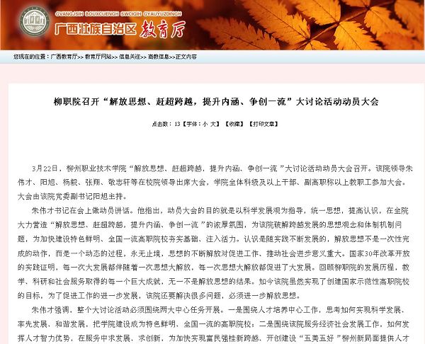 3月28日,广西教育厅网站发布我院召开“解放思想、赶超跨越,提升内涵、争创一流”大讨论活动动员大会的信息。(崔智慧)