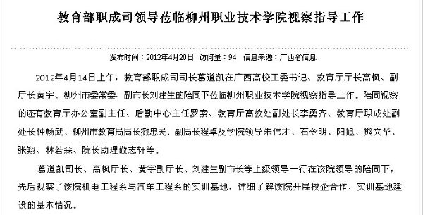 2012年4月20日,中国高职高专网发布教育部职成司领导莅临我院视察指导工作的信息。(崔智慧)