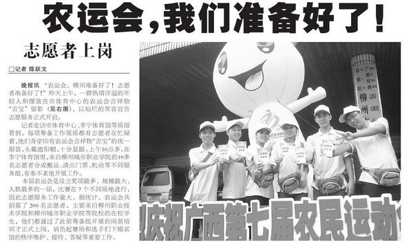 2012年5月15日,《柳州晚报》报道我院学生参与农运会志愿服务的新闻。(蒋玉梅)